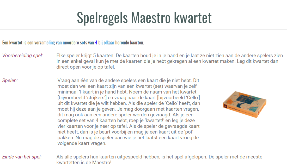 Maestro Kwartet Helaas is het kwartspel uitverkocht. Kwartet – Quartet – Quartett Helaas uitverkocht ;-( Spelregels Het Maestro muziekinstrumenten kwartetspel werd geïntroduceerd tijdens de Duitse Spiel spellenbeurs The Maestro Quartet was introduced during the German game event Spiel. game rules Das Maestro-Quartett-Spiel wird während der deutschen Spielevent Spiel eingeführt werden.